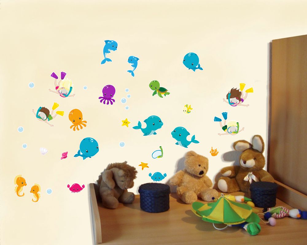Mit diesem Wandtatoo Set verwandelst du ein Kinderzimmer in kurzer Zeit in eine coole Unterwasser Welt. Das Set besteht aus 34 Aufklebern. Unter anderem enthalten sind folgende Motive: Wal, Delphin, Seepferd, Taucher, Schildkröte, Krabbe, Krake und Sterne.