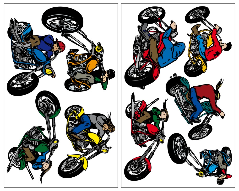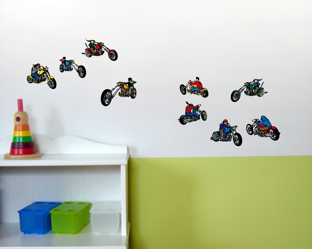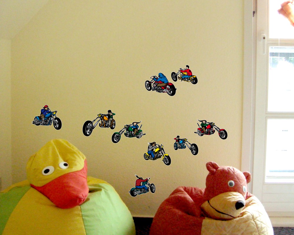 Die 9 coolen Motorrad Fahrer auf Choppern warten darauf die Wände von kleinen Motorrad Fans zu schmücken. Das Wandtattoo Set besteht aus 9 unterschiedlichen Aufklebern und eignet sich bestens zur Kinderzimmer Deko oder auch als Geschenk.